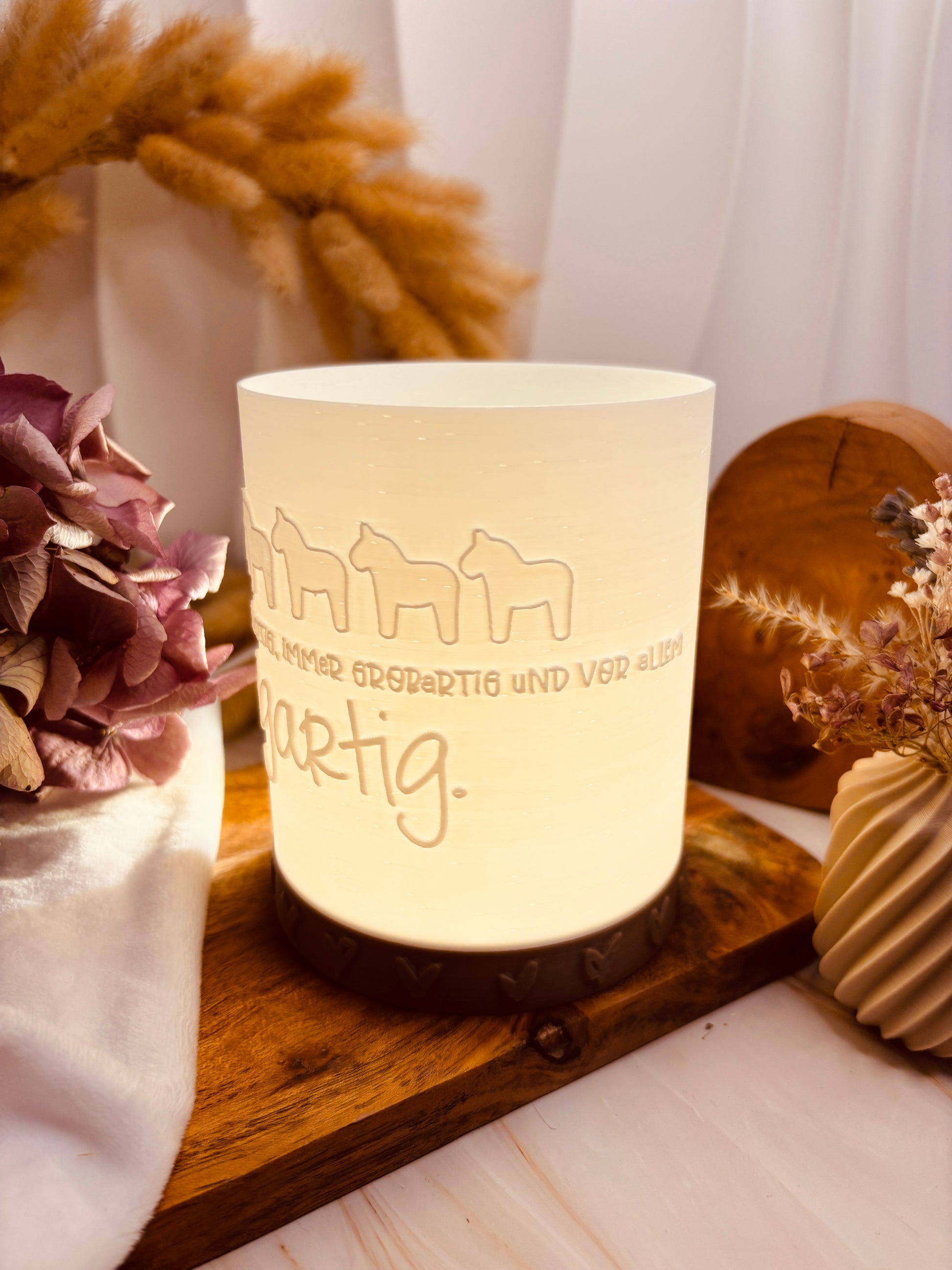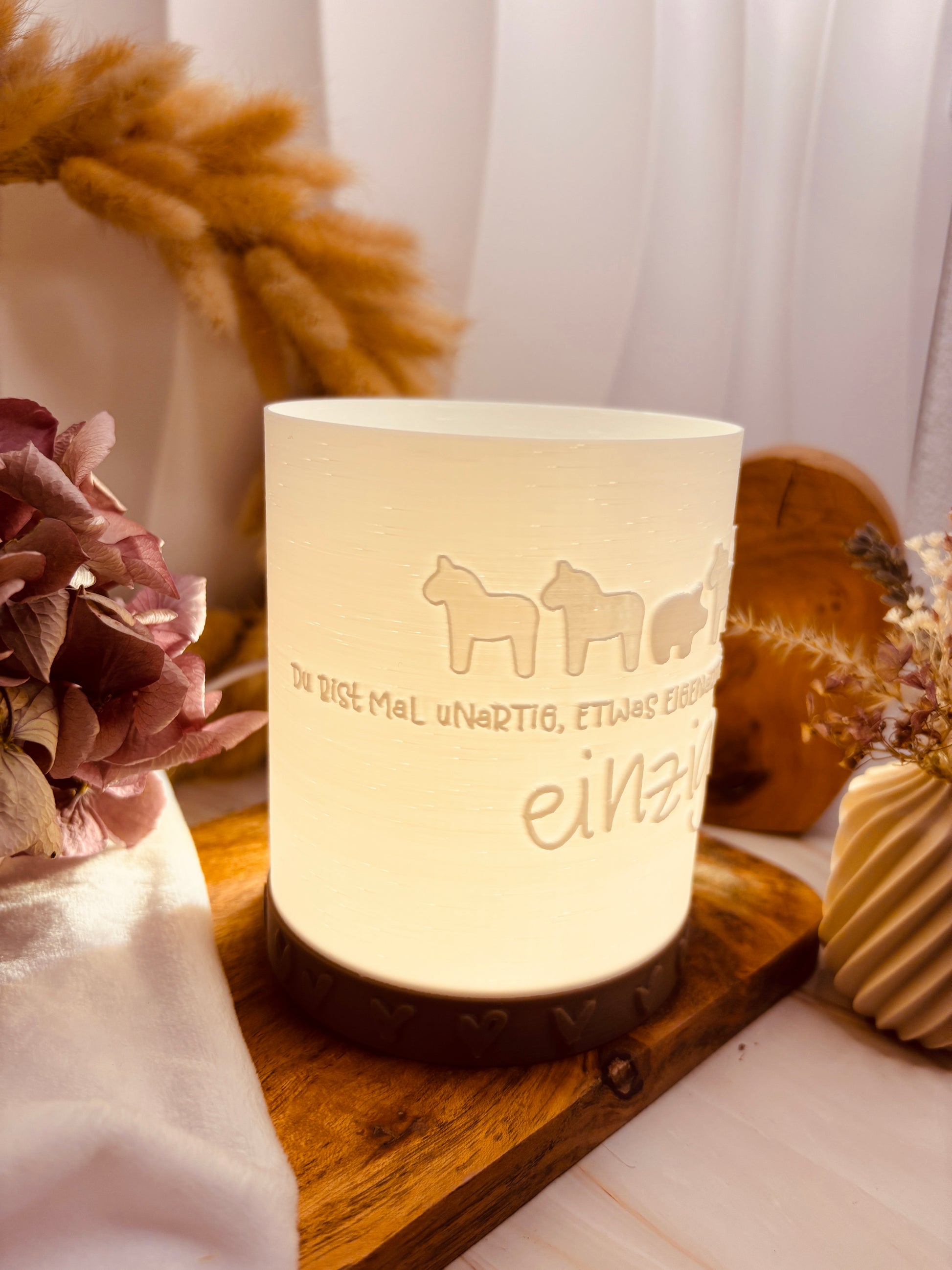 Dieses liebevoll designte 3D-Druck-Set aus Windlicht und Sockel enthält alles, was Du für die einfache Herstellung eines bezaubernden Windlichts mit wundervollm Motiv benötigst.